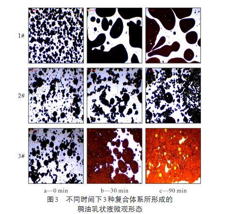圖3不同時間下3種復(fù)合體系所形成的稠油乳狀液微觀形態(tài)