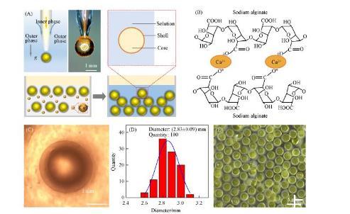 為了實現(xiàn)一步法制備大小均勻、尺寸可控、壁厚可調(diào)、生物相容的水/水微囊,需要設計同軸微流控器件,如圖1(A)所示。內(nèi)相黃原膠水溶液由內(nèi)管注入微流控器件;外相海藻酸鈉水溶液,由外管注入微流控器件。內(nèi)相在外相的剪切下形成液滴,同時外相在重力作用下脫離管口生成水包水的水/水微囊,并進一步通過鈣離子交聯(lián)海藻酸鈉水凝膠網(wǎng)絡,如圖1(B)所示。由于微流控器件對內(nèi)外相的精準調(diào)控,水/水微囊在光學顯微鏡下具有清晰穩(wěn)定的核殼結(jié)構(gòu)圖1(C),平均尺寸(D)為(2.83±0.09)mm圖1(D)。該方法制備水/水微囊具有器件結(jié)構(gòu)簡單、操作便捷、一步法成型、微囊尺寸均一可控、核殼結(jié)構(gòu)穩(wěn)定、無需后處理等優(yōu)點圖1(E)。