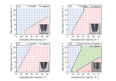 為了深入研究微流控器件結(jié)構(gòu)對水/水微囊成型過程的影響規(guī)律,分別制備了內(nèi)管管口內(nèi)縮、內(nèi)外管管口平齊、內(nèi)管管口伸出、內(nèi)管管口內(nèi)縮外管管口不拉伸等4種同軸微流控器件,并通過系統(tǒng)改變內(nèi)相和外相流速,判斷水/水微囊的成型情況,最終確定水/水微囊的制備相圖,分別如圖2(A)——(D)所示。水/水微囊形成的關(guān)鍵是內(nèi)相在外相的剪切下形成液滴,同時外相在重力作用下脫離管口生成水/水微囊。由于內(nèi)外相均是水溶液,內(nèi)相/外相界面張力較小,并且流體黏度較大,內(nèi)相不容易在外相的剪切下形成液滴,進而被外相包裹形成水/水微囊,因此外相流速增大,對內(nèi)相剪切加強,更易形成水/水微囊。