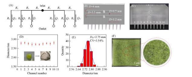 在確定平行放大微流控器件通道結(jié)構(gòu)尺寸設(shè)計(jì)后,通過(guò)SolidWorks建立三維模型,并利用光固化3D打印機(jī)直接打印微流控器件。實(shí)驗(yàn)表明,10個(gè)并排微流控通道均可以穩(wěn)定生成水/水微囊,并且所生成的微囊具有較一致的尺寸大小和較均勻的分散性。綜合統(tǒng)計(jì)10個(gè)微流控通道形成的微囊分布,可以得到D=(2.75±0.10)mm.在10個(gè)平行微流控通道設(shè)計(jì)下,水/水微囊的產(chǎn)率可以達(dá)到0.5 kg/h,并可依據(jù)相同原理,進(jìn)一步增加平行通道的數(shù)量,提高產(chǎn)率,實(shí)現(xiàn)尺寸均一水/水微囊的高通量制備。