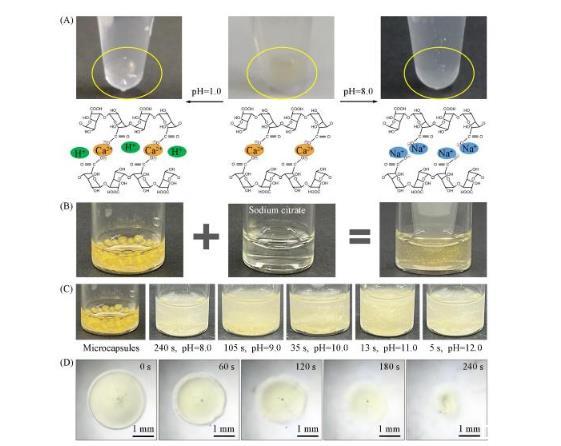 所制備的水/水微囊具有良好的生物相容性、尺寸均一性及較高的包裹率和裝載率,是各種活性物質(zhì)的理想載體,并且能夠?qū)H變化做出響應(yīng),實(shí)現(xiàn)可控釋放。如圖5(A)所示,水/水微囊的殼層是由二價(jià)鈣離子交聯(lián)的海藻酸鈉水凝膠組成,在酸性環(huán)境下具有良好的穩(wěn)定性,但在堿性環(huán)境下海藻酸鈉水凝膠與二價(jià)鈣離子的結(jié)合能力變?nèi)酰宦?lián)網(wǎng)絡(luò)被破壞,從而釋放內(nèi)核活性物質(zhì)。如果在溶液中加入檸檬酸鈉,二價(jià)鈣離子更傾向于與檸檬酸根結(jié)合,從而破壞交聯(lián)網(wǎng)絡(luò),也可以溶解水/水微囊。如圖5(C)所示,水/水微囊的溶解速率隨pH的增大而提高。當(dāng)水/水微囊的囊壁被溶解后,內(nèi)核物質(zhì)逐漸被釋放出來(lái),展現(xiàn)出良好的pH響應(yīng)性和可控釋放。