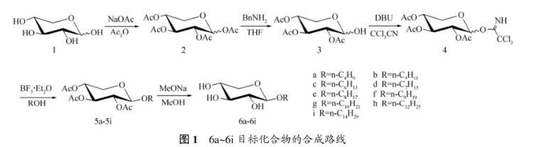 采用全乙酰化的木糖(2)在四氯化錫催化下與一系列脂肪醇發(fā)生偶聯(lián)反應(yīng),對時(shí)間要嚴(yán)格控制,否則有部分轉(zhuǎn)化成α-異構(gòu)體,當(dāng)時(shí)間過長時(shí),還會(huì)形成以α-糖苷為主的產(chǎn)物和少量2-位脫保護(hù)的糖苷副產(chǎn)物。參考烷基-β-D-葡萄糖苷等合成與性能研究成果,按照Scheme1所示的路線,以D-木糖(1)為原料通過乙酰化、脫1-位乙酰基、與三氯乙腈反應(yīng),得到相應(yīng)的三氯乙酰亞胺酯(4)。采用易于構(gòu)筑1,2-反式糖苷鍵的三氯乙酰亞胺酯法,以三氟化硼乙醚作糖苷化偶聯(lián)反應(yīng)的催化劑,使得具有鄰基參與效應(yīng)的三氯乙酰亞胺酯(4)與相應(yīng)的脂肪醇反應(yīng)及相應(yīng)的脫乙酰基保護(hù),合成一系列烷基-β-D-吡喃木糖苷,如圖1所示。本文作者對其溶解性、表面張力、乳化性能、液晶性能、熱穩(wěn)定性等理化性質(zhì)進(jìn)行研究。