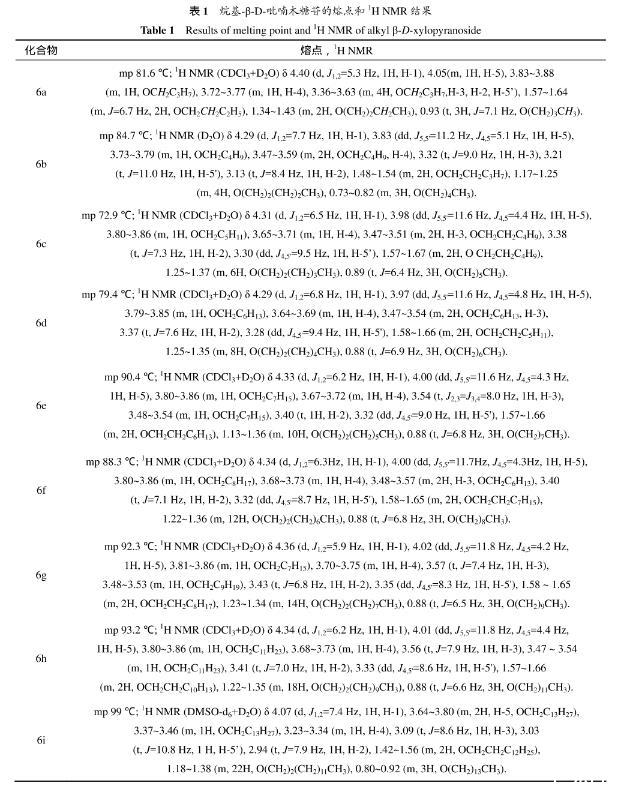 表1烷基-β-D-吡喃木糖苷的熔點和1H NMR結(jié)果