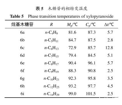 具有液晶特征的化合物因加熱而呈現(xiàn)所謂的“雙熔融轉(zhuǎn)變”的相變現(xiàn)象,當(dāng)加熱達(dá)到其熔點(diǎn)(p)時(shí),結(jié)晶性的固態(tài)首先轉(zhuǎn)變成半透明的液晶態(tài),接著在較高的溫度(p)下轉(zhuǎn)變成各向同性的清亮的液態(tài)。表5所示為木糖苷的相轉(zhuǎn)變溫度。從表5可見(jiàn):烷基-β-D-吡喃木糖苷屬于一頭一尾(one head one tail)或一頭組一鏈(one head group-one chain)且呈現(xiàn)多態(tài)性的雙親吡喃糖苷分子,在加熱時(shí)其相變發(fā)生在相對(duì)較小的溫度區(qū)間,但都出現(xiàn)了液晶相,且當(dāng)疏水性烷基碳鏈長(zhǎng)度為6時(shí),烷基-β-D-吡喃木糖苷相變溫度之差(Δ)較大,其他的都比較接近。在木糖苷中,烷基有助于提升分子取向的穩(wěn)定性,且這種穩(wěn)定性對(duì)液晶相的生成是必要的。但由于烷基-β-D-吡喃木糖苷為環(huán)狀的糖苷只有3個(gè)游離羥基,比烷基--D-吡喃葡萄糖苷少了親水性頭部的糖環(huán)上的羥甲基,也比木糖醇的十二烷基單醚少了1個(gè)游離的羥基,清亮點(diǎn)p不高,所以,得到的烷基-β-D-吡喃木糖苷具有液晶相,但相變溫度范圍(?=p?p)較窄,液晶相的穩(wěn)定性較弱。