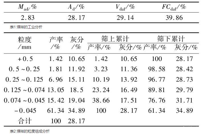 由表1、2可知,該煤樣水分為2.83%,灰分為28.17%,揮發(fā)分為29.14%,固定碳含量為39.86%。-0.045 mm粒級以下的煤泥產(chǎn)率為61.34%,灰分為34.89%,說明該煤樣中細(xì)粒煤占比大且灰分較高,煤樣為高灰細(xì)粒難浮煤泥。