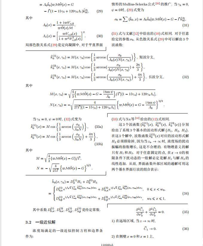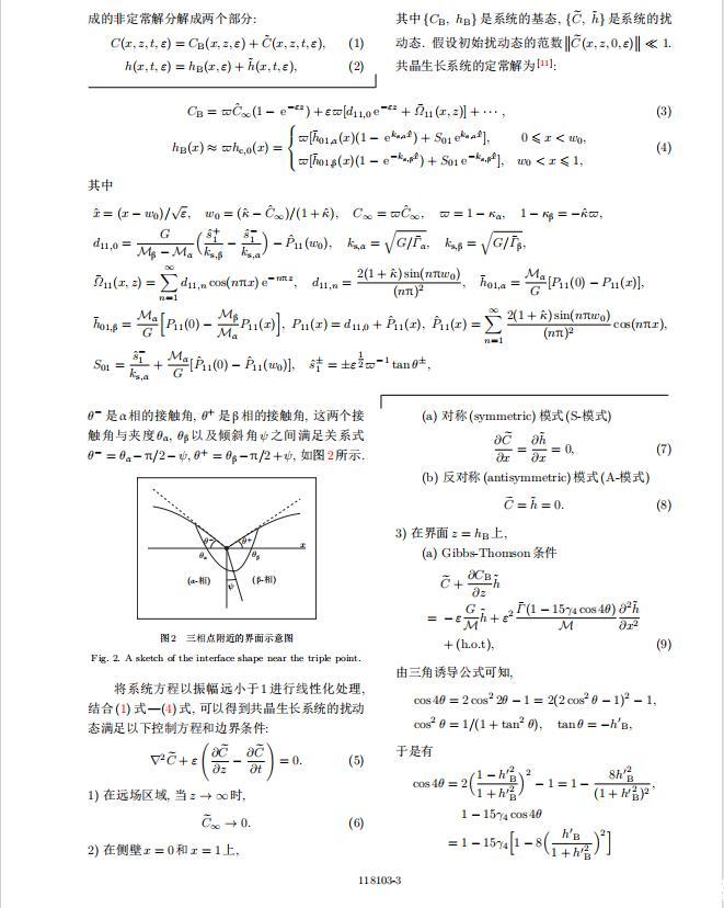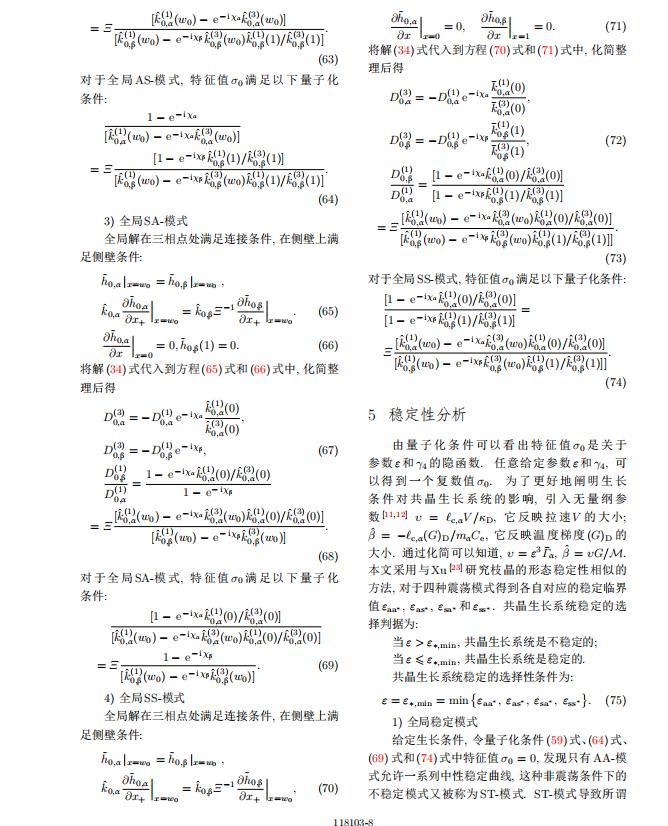 將系統(tǒng)方程以振幅遠(yuǎn)小于1進(jìn)行線性化處理,結(jié)合(1)式—(4)式,可以得到共晶生長系統(tǒng)的擾動(dòng)態(tài)滿足以下控制方程和邊界條件: