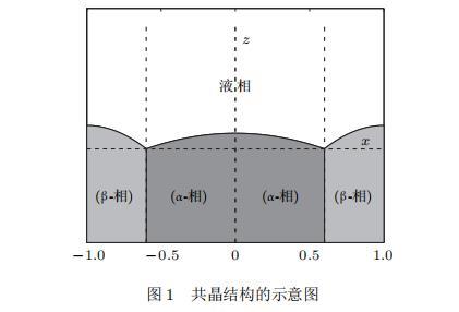 假設(shè)由α和β兩相組成的片層共晶以拉度V向液相穩(wěn)定推進(jìn),共晶片層與固-液界面垂直.選取固-液界面處α相片層的中心為坐標(biāo)原點(diǎn),x軸與片層垂直,z軸與晶體生長方向平行,如圖1所示.共晶界面用函數(shù)z=h(x,t)表示,它也是共晶生長解的一部分.