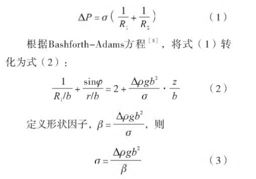 座滴法是基于熔體(液體)在水平托板表面形成穩(wěn)定橢球液滴的形狀參數(shù)測量表面張力的方法[6]。基于座滴法測量玻璃熔體表面張力,玻璃熔體在水平托板上受重力和表面張力共同作用形成旋轉(zhuǎn)軸對稱橢球[7](圖1),橢球表面任一點的壓力差與表面張力之間的數(shù)學關系見式(1):