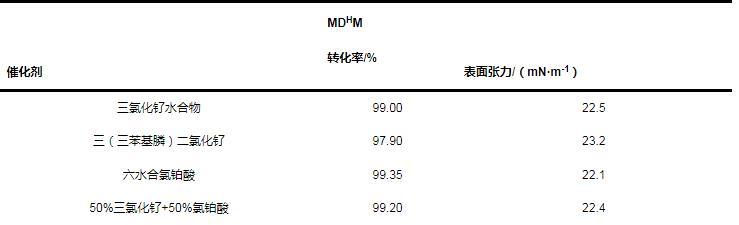 分別以三氯化釕、三(三苯基膦)二氯化釕、六水合氯鉑酸和50%三氯化釕+50%氯鉑酸為催化劑,在以下條件下合成BEOTSS:催化劑用量30 mg/kg(以Ru或Pt質(zhì)量計(jì)),n(BEO)∶n(MDHM)=1.05∶1,反應(yīng)時(shí)間6.0 h,反應(yīng)溫度100℃。測定MDHM轉(zhuǎn)化率以及0.1%BEOTSS水溶液的表面張力,結(jié)果如表1所示。可以看出,這幾種催化劑的效果均較好,MDHM轉(zhuǎn)化率在97%以上,表面張力低于24 mN/m。其中,三氯化釕的催化效果與傳統(tǒng)的氯鉑酸相差不大,只是所得產(chǎn)物為黃色液體,比氯鉑酸的產(chǎn)物顏色深。考慮到三氯化釕價(jià)格比氯鉑酸便宜很多,因此采用三氯化釕作為催化劑具有很好的成本優(yōu)勢。