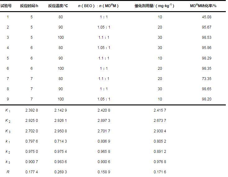 根據(jù)極差R的大小,確定各因素對(duì)反應(yīng)轉(zhuǎn)化率影響的大小順序?yàn)椋悍磻?yīng)溫度B>反應(yīng)時(shí)間A>催化劑用量D>原料配比C。通過(guò)正交試驗(yàn)結(jié)果確定釕催化合成工藝的最優(yōu)方案為A 2 B 3 C 2 D 3,即反應(yīng)時(shí)間6.0 h、反應(yīng)溫度100℃、n(BEO)∶n(MDHM)為1.05∶1、催化劑用量30 mg/kg。