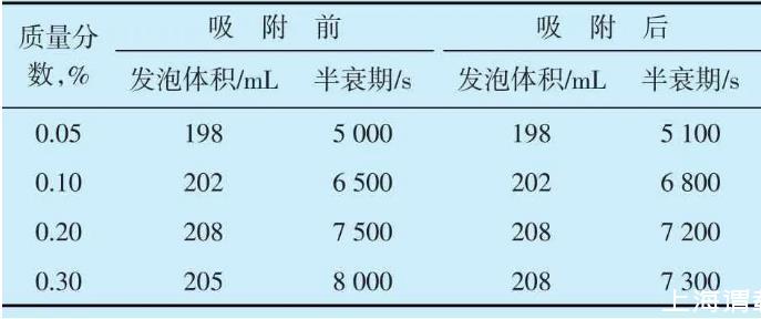 配制質(zhì)量分?jǐn)?shù)為0.05%,0.10%,0.20%和0.30%的磺基甜菜堿泡沫劑,再分別充入純度為99.9%的氮?dú)猓昧_氏泡沫儀測(cè)試氮?dú)馀菽w系吸附前后的泡沫性能。評(píng)價(jià)結(jié)果(表1)表明,當(dāng)溫度為80℃時(shí),不同質(zhì)量分?jǐn)?shù)的氮?dú)馀菽w系在吸附前后發(fā)泡體積均保持在200 mL左右,半衰期大于5 000 s,表明均具有良好的起泡性能和穩(wěn)定性能。