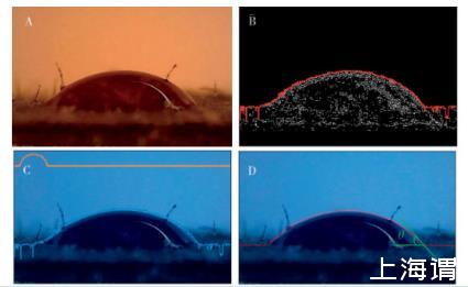 A.顯微鏡拍攝的葉面測試液滴B.用Canny算法進(jìn)行邊緣檢測(紅色線為提取的輪廓曲線)C.輪廓擬合(黃色線為去除干擾后的輪廓曲線)D.確定并測定接觸角(紅色線為優(yōu)化后的輪廓曲線,右側(cè)兩條綠色線的夾角即為接觸角θ)。放大倍數(shù)為1 000倍