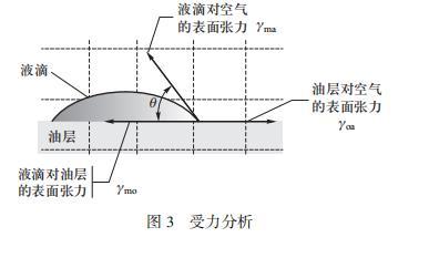 液滴爆炸現(xiàn)象的第二階段邊緣處的液滴產(chǎn)生液滴噴發(fā)現(xiàn)象,在該過(guò)程中液滴中部較厚的部分不斷向邊緣輸送液體,因此會(huì)穩(wěn)定持續(xù)一段時(shí)間。為解釋這一階段,先從表面張力入手,因?yàn)榻佑|角的不同,水對(duì)油的表面張力大于乙醇對(duì)油的表面張力,則混合液體對(duì)油層的界面張力介于水和乙醇之間。混合液滴中乙醇的比例越大,混合液體對(duì)油層的界面張力越小,受到向內(nèi)的張力減小,這樣整體向外的張力增大,這是產(chǎn)生向外推動(dòng)的驅(qū)動(dòng)力的重要原因。可見(jiàn)界面張力直接決定了液滴在界面上的擴(kuò)散和運(yùn)動(dòng)。
