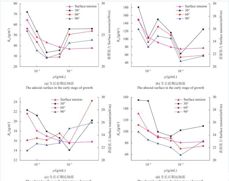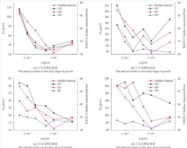 圖5為不同質(zhì)量濃度Triton X-100溶液在蘋果葉片近、遠(yuǎn)軸面的Rm變化規(guī)律。從中可以看出,不同傾角下蘋果葉片生長前期近、遠(yuǎn)軸面的Rm值和表面張力均隨溶液質(zhì)量濃度的升高而不斷減小,當(dāng)Triton X-100溶液質(zhì)量濃度達(dá)到cmc時(shí),近軸面Rm值與表面張力的變化趨于平緩,而遠(yuǎn)軸面的Rm值則出現(xiàn)大幅波動(dòng)。其原因可能與Triton X-100表面活性效率高(cmc=1.32×10?4 g/mL)有關(guān),同時(shí)溶液色散分量占比會(huì)隨溶液質(zhì)量濃度的升高而提高,而對(duì)蘋果葉片遠(yuǎn)軸面表面自由能起主導(dǎo)作用的也是色散分量,以上多重因素導(dǎo)致遠(yuǎn)軸面的Rm值產(chǎn)生波動(dòng)。蘋果葉片生長后期Rm與表面張力隨溶液質(zhì)量濃度的變化與生長前期相似。