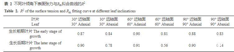 由表2結(jié)果可知,蘋果葉片生長(zhǎng)前期近、遠(yuǎn)軸面和生長(zhǎng)后期近軸面,不同葉傾角下表面張力與Rm值擬合曲線的R2均高于0.80。而蘋果葉片生長(zhǎng)后期遠(yuǎn)軸面除30°時(shí)R2高于0.7外,其他葉傾角下均低于0.6,且隨著葉傾角增大,R2不斷減小,這表明蘋果葉片生長(zhǎng)后期遠(yuǎn)軸面的表面張力與Rm值之間的線性關(guān)系較差。