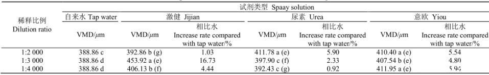 注:數(shù)字后不同字母表示同1行不同溶液間差異顯著(<0.05),括號(hào)內(nèi)字母表示同1列數(shù)值顯著性差異(<0.05)。VMD:霧滴體積中徑。下同。