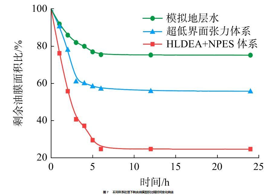 2)HLDEA+NPES體系可將油水界面張力降低至3.8×10?3 mN/m,水下油滴接觸角由41.34°增加至162.53°,使得24 h內(nèi)油膜剝離率高達75.3%。