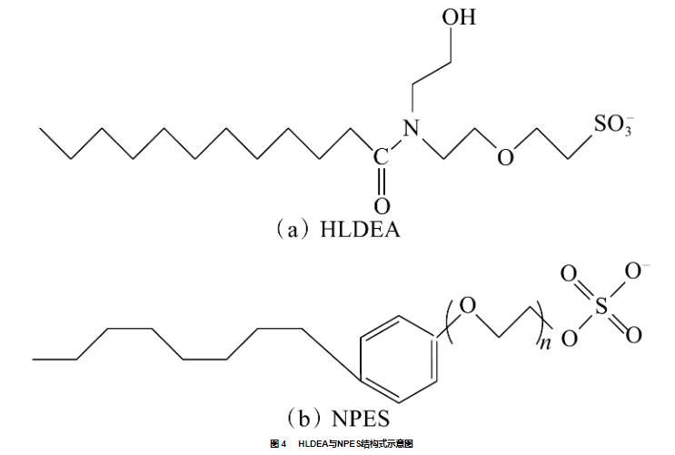將配制好的穩(wěn)定性優(yōu)異的復(fù)配體系[0.15%(w)HLDEA+0.15%(w)助表面活性劑]置于75℃條件下,測定復(fù)配體系的油水界面張力,結(jié)果見圖3。由圖3可得,復(fù)配后體系油水界面張力隨時間均出現(xiàn)先下降后基本保持平衡的趨勢。HLDEA與兩種陰非離子型表面活性劑APEC-4Na和NPES復(fù)配后體系的油水界面張力降低至接近超低界面張力水平(10?3 mN·m?1)。這是因為HLDEA分子小、親油性高,其擴散速度快且傾向于進入油滴內(nèi)部,同時,溶液中的NPES分子隨時間推移逐步被吸引于油水界面,尾鏈與HLDEA分子相互糾纏形成緊密結(jié)構(gòu),提高了油水界面吸附膜的致密程度,從而使界面張力大幅降低。最終優(yōu)選出的助表面活性劑為NPES,在與HLDEA復(fù)配后體系界面張力值為3.8×10?3 mN/m。HLDEA與NPES結(jié)構(gòu)式見圖4。作為對比的超低界面張力體系油水界面張力值為2.9×10?4 mN/m,較HLDEA+NPES體系界面張力低了一個數(shù)量級。