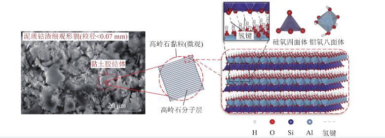 圖2中,在微觀尺度層面,由于高嶺石形成過(guò)程中發(fā)生同晶置換,使晶層表面帶永久負(fù)電荷。當(dāng)高嶺石黏粒遇水時(shí),水分子的偶極性使氫原子易與高嶺石晶層表面電負(fù)性較強(qiáng)的氧原子結(jié)合形成氫鍵,同時(shí),吸附在晶層表面的水分子之間也會(huì)通過(guò)氫鍵連接,該過(guò)程即為水分子的吸附過(guò)程。當(dāng)?shù)?層水分子被高嶺石黏粒吸附后,其外側(cè)氧原子呈負(fù)電性,繼續(xù)與第2層水分子的氫原子以氫鍵形式結(jié)合,最終形成多層水分子“水膜”。高嶺石黏粒不斷吸水?dāng)U層,使鉆渣顆粒體積不斷膨脹,同時(shí)伴隨鉆渣內(nèi)部非泥質(zhì)礦物的溶解,高嶺石黏粒間距變小,并通過(guò)外側(cè)“水膜”相互吸附,構(gòu)成“水橋”,使得多個(gè)高嶺石黏粒能夠在遇水后聚集,形成更大的團(tuán)聚體。