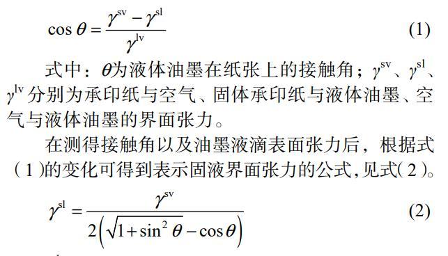 式中:θ為液體油墨在紙張上的接觸角;γsv、γsl、γlv分別為承印紙與空氣、固體承印紙與液體油墨、空氣與液體油墨的界面張力。在測得接觸角以及油墨液滴表面張力后,根據(jù)式(1)的變化可得到表示固液界面張力的公式,見式(2)。