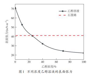 水和乙醇的表面張力分別為70.95 mN·m-1和22.17 mN·m-1,我們采用一定體積比的乙醇和水調(diào)配出與微晶石墨表面能接近的乙醇水溶液,并以此為溶劑球磨微晶石墨,研究溶劑的表面張力對球磨后微晶石墨粒徑的影響。從圖1可知,25%乙醇溶液的表面能為40.69 mN·m-1,與石墨烯的表面能(40.80 mN·m-1)相近,從圖2可知,其對應的微晶石墨中位粒徑最小。當溶劑的表面能與微晶石墨表面能相近時,微晶石墨能更好地分散在溶劑中,從而提高球磨效率。所以在本工作中,選擇25%的乙醇水溶液作為球磨溶劑。