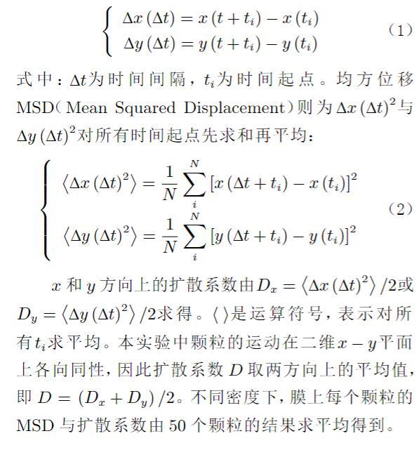 實驗采用Olympus顯微鏡(配備60倍物鏡)觀察顆粒在膜上的布朗運動,同時利用電子增益高速攝像機(Andor 897 EMCCD)進行拍攝。每個視頻拍攝時間為200 s,幀頻為0.05 s,曝光時間5 ms,圖像尺寸為300像素×300像素,分辨率為0.26μm/m。采集原始圖像中的顆粒灰度值不符合標(biāo)準(zhǔn)高斯分布,因此使用圖像處理軟件ImageJ對圖像進行背景去噪聲(Background Subtraction)和高斯模糊(Gauss-ian Blur)處理(圖3(a)),使顆粒灰度值達到標(biāo)準(zhǔn)高斯分布(圖3(b))。之后用Video Spot Tracker軟件定位每個顆粒的灰度峰值(圖3(c)),即顆粒質(zhì)心,定位誤差僅為0.5像素,進而對顆粒二維運動軌跡(平面)進行實時跟蹤。軟件自動將顆粒在每一時刻的像素位置坐標(biāo)存入計算機中,使用MATLAB計算顆粒在不同時間間隔Δt內(nèi)沿和方向的位移,計算公式如下: