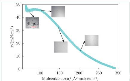 圖2為膜表面壓強隨膜密度的變化曲線,(以DPPC磷脂分子所占平均面積作為衡量膜密度的物理量)。在顯微鏡下觀察了膜在不同密度下的形貌(圖2中4張照片)。膜被壓縮到100?2/molecule之前,處于液態(tài)擴張(Liquid Expanded,LE)相,磷脂分子排列較松散,膜表面結(jié)構(gòu)均勻。當(dāng)膜被壓縮到60~100?2/molecule時,膜上開始出現(xiàn)直徑為幾微米的磷脂凝聚(Tilted Condensed,TC)相(照片中斑點),TC區(qū)域內(nèi)磷脂分子的排列比LE區(qū)域更緊密。熒光劑Texas red DHPE傾向于分布在LE區(qū)域,因此LE區(qū)域顯示為淺色,TC區(qū)域顯示為深色。膜繼續(xù)被壓縮,在LE?TC共存相階段,膜表面壓強恒定在45 mM/m左右,TC區(qū)域數(shù)量和面積占比增大。當(dāng)膜被進一步壓縮(<60?2/molecule),此時膜表面幾乎被TC區(qū)域占據(jù),TC區(qū)域相互擠壓,導(dǎo)致膜表面壓強直線上升,LE區(qū)域僅存在于TC區(qū)域之間的空隙。