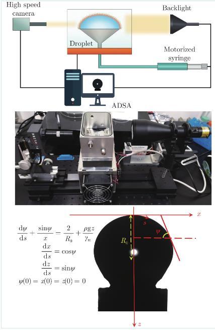 采用課題組自主研發(fā)的約束液滴表面測量儀(Constrained Drop Surfactometry,CDS)測量膜在不同密度下的表面張力,如圖1所示,圖中x與z分別代表水平與豎直方向,s代表液滴表面切向方向,ψ為液滴表面與水平方向內(nèi)夾角,R0為液滴半徑,ρ為液滴密度,g為重力加速度。CDS上的圓形基座用于盛放純水液滴(約10μL),以微量進樣針將稀釋的固爾蘇–氯仿溶液滴定到液滴表面,形成形狀類似于肺泡的水?氣界面固爾蘇肺表面活性劑膜。基座中央的小孔通過導(dǎo)管與注射器相連,注/抽水速度由Labview編程的推進器控制,以此調(diào)節(jié)液滴表面積的變化速率。實驗測量的是膜在壓縮過程中表面張力與膜密度變化的關(guān)系,液滴表面積以0.05的準(zhǔn)靜態(tài)速率縮小。液滴的輪廓由照相機拍攝。膜表面張力和表面積以ADSA(Axisymmetric Drop Shape Analysis)方法分析得出。膜表面壓強,其中,純水表面張力。