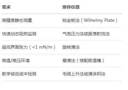 樣品性質(zhì):高粘度液體適合懸滴法或旋轉(zhuǎn)滴法,易揮發(fā)液體需密閉測量(如氣泡壓力法)。