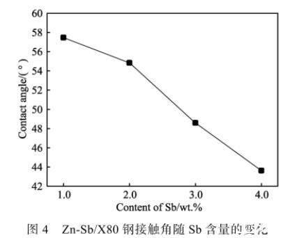 2)添加元素Sb在一定程度上能改善鋅液與X80鋼的潤濕性,Zn-Sb/X80鋼潤濕體系接觸角隨Sb含量的增大而逐漸減小。當Sb的質量分數為1.0%時,Zn-Sb/X80鋼體系接觸角為57°左右;Sb質量分數為4.0%時,接觸角約為43°,此時潤濕效果最好。