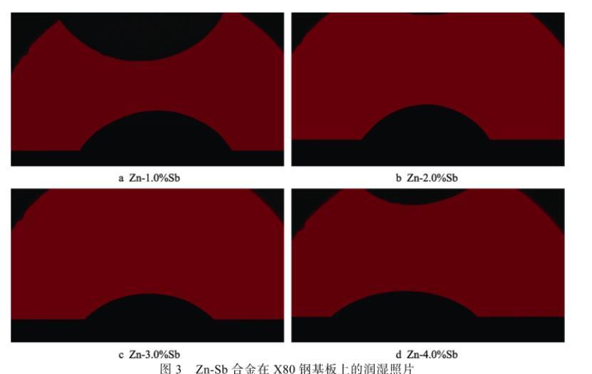 在實驗過程中,鋅合金熔體在基板上的潤濕時間很短,潤濕體系會很快達到平衡,且鋅合金熔體中Sb元素的添加量很少,根據Fe-Sb二元相圖可知,在450℃滴落溫度下,Fe與Sb之間的固溶度極小并無化合物生成,與X80鋼基板發(fā)生反應的元素主要是Zn,可以認為Sb添加對降低鋅液與X80鋼基體之間界面張力σsl的影響相對較小,由此Zn-Sb合金熔體與X80鋼基板之間的潤濕角主要取決于鋅合金熔體的表面張力σlv,表面張力σlv越小,接觸角越小,即鋅合金熔體與X80基板之間的潤濕性越好。