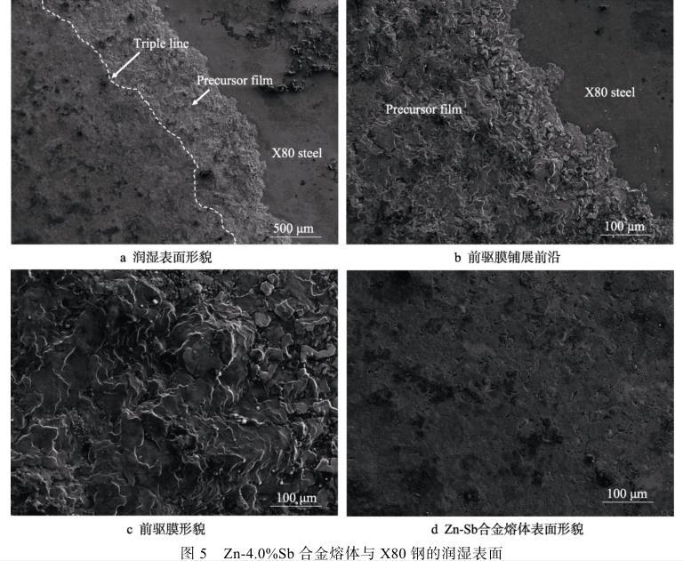 圖5b為前驅膜鋪展前沿形貌,由于前驅膜的寬度不均勻,在前驅膜較寬處Zn-Sb合金熔體流動較快,較窄的地方熔體流動較慢,因此導致鋪展前沿呈曲折狀。通過能譜檢測發(fā)現,前驅膜成分主要是Zn與Fe的反應產物,在其表面分布有一定量的Sb元素,且在前驅膜表面的Sb含量高于Zn-Sb合金熔體表面的Sb含量。分析認為,這是由于鋅液表面的活性元素Sb在固/液界面富集,在X80鋼基板表面快速吸附形成薄膜,并在三相線前沿的作用下繼續(xù)向前流動,產生前驅膜。前驅膜的形成使得之后的鋅合金熔體在前驅膜上鋪展,鋪展到前驅膜的位置時,產生新的前驅膜,直到界面達到平衡停止鋪展。