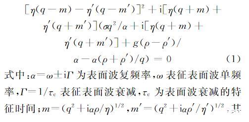 式中:α=ω±iΓ為表面波復頻率,ω表征表面波單頻率,Γ=1/τc表征表面波衰減,τc為表面波衰減的特征時間;m=(q2+iαρ/η)1/2,m′=(q2+iαρ′/η′)1/2,其中未知參數(shù)q、η、η′、ρ、ρ′分別為表面波波數(shù)、液相黏度、氣相黏度、液相密度、氣相密度;σ為表面張力。