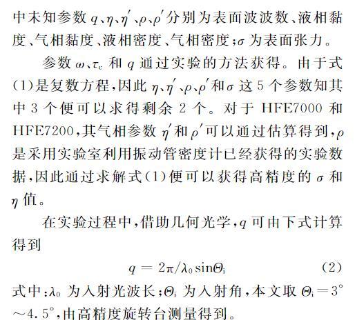 參數(shù)ω、τc和q通過實驗的方法獲得。由于式(1)是復數(shù)方程,因此η、η′、ρ、ρ′和σ這5個參數(shù)知其中3個便可以求得剩余2個。對于HFE7000和HFE7200,其氣相參數(shù)η′和ρ′可以通過估算得到,ρ是采用實驗室利用振動管密度計已經(jīng)獲得的實驗數(shù)據(jù),因此通過求解式(1)便可以獲得高精度的σ和η值。