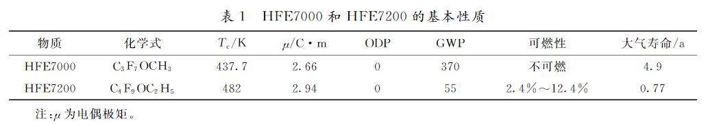 氫氟醚HFE7000、HFE7200具有良好的物化性質(zhì)和環(huán)境性能,是多種化工合成物的原料。如表1所示,HFE7000、HFE7200的臭氧破壞潛能(ODP)均為0,溫室效應潛能(GWP)分別為370和55,大氣壽命為4.9和0.77 a。此外,HFE7000、HFE7200還具有高揮發(fā)性、低表面張力,可作為電子元器件的冷卻介質(zhì),還可以替代HCFC-141b、HFC-43-10mee作為工業(yè)清洗劑。在能源領域,HFE7000還可作為朗肯循環(huán)工質(zhì),用來回收低溫熱源的低品位能量。