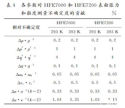 表4給出了式(11)、(12)中各參數(shù)對(duì)HFE7000和HFE7200表面張力和黏度在溫度上下限(T=293~393 K)的擴(kuò)展測(cè)量不確定度的貢獻(xiàn)。其中,兩種物質(zhì)在T=293 K時(shí),表面張力擴(kuò)展測(cè)量不確定度為0.33%,黏度擴(kuò)展測(cè)量不確定度分別為1.04%和1.03%;當(dāng)T=393 K時(shí),表面張力擴(kuò)展測(cè)量不確定度為0.33%,黏度擴(kuò)展測(cè)量不確定度分別為1.35%和1.13%;表面張力的不確定度保持不變,隨著溫度的升高,黏度測(cè)量的擴(kuò)展測(cè)量不確定度升高。越接近臨界溫度,氣相密度和黏度對(duì)擴(kuò)展測(cè)量不確定度的貢獻(xiàn)越大。因此,本文HFE7000和HFE7200表面張力的擴(kuò)展測(cè)量不確定度(置信因子k=2)估計(jì)為0.35%,黏度的擴(kuò)展測(cè)量不確定度(k=2)分別估計(jì)為1.35%和1.13%。