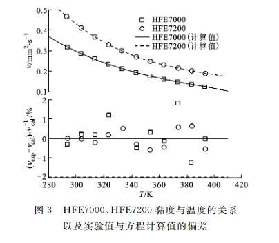 圖3 HFE7000、HFE7200黏度與溫度的關(guān)系以及實(shí)驗(yàn)值與方程計(jì)算值的偏差
