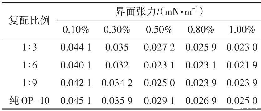 將HPAM配制成質(zhì)量分數(shù)為0.10%的水溶液,與不同濃度的OP-10按不同比例復(fù)配,并測定不同復(fù)配體系的界面活性,結(jié)果見表3。
