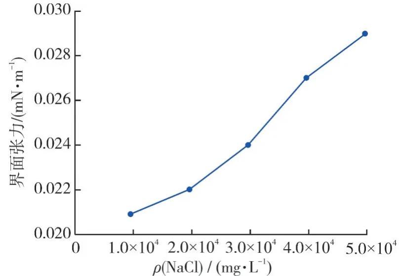 4)隨著礦化度的增加,最佳二元復(fù)配體系的界面張力最大只變化了0.008 mN/m左右,證明HPAM和OP-10復(fù)配體系保留了非離子表面活性劑的特點,抗鹽性能較好。