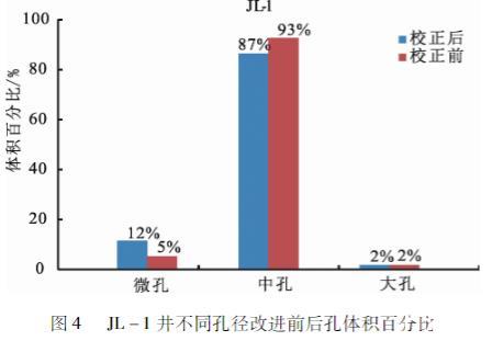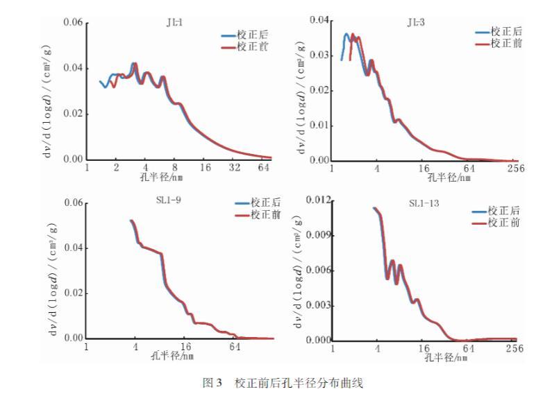 同樣應(yīng)用參數(shù)校正前后的Washburn方程對(duì)松遼盆地青山口組JL-1、JL-3、SL1-9、SL1-13井的泥頁(yè)巖樣品的數(shù)據(jù)處理、對(duì)比發(fā)現(xiàn)——參數(shù)校正后的方程對(duì)于半徑為4 nm以下的孔有較大的影響,對(duì)于半徑為4 nm以上的孔基本上沒有影響(圖3)。