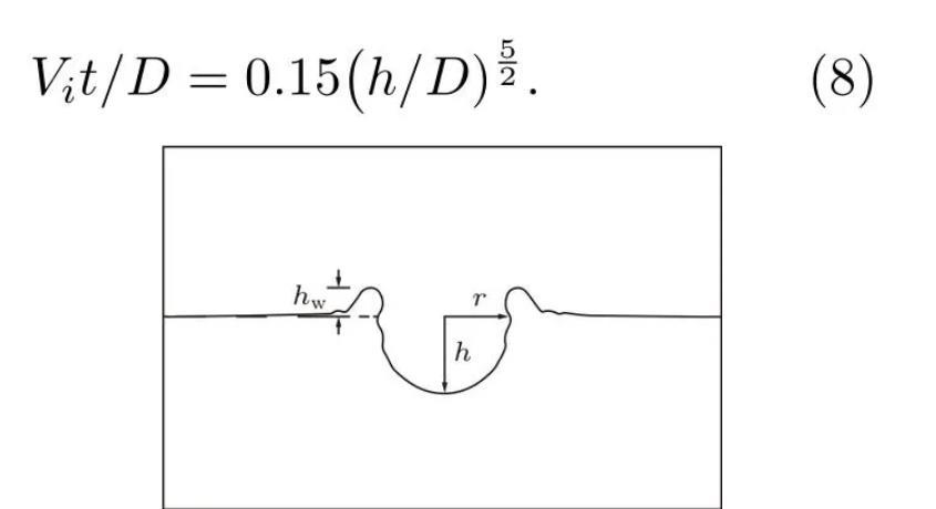 3)液滴撞擊深水液池后,空腔深度先以較快速度增長,在到達最大空腔深度后快速回彈,至接近原自由液面后速度逐漸放緩。在忽略毛細波作用、空腔深度為h=D至h=hmax范圍內(nèi)的前提下,空腔深度隨時間的成長關(guān)系可由(Vit)/D=0.15(h/D)5/2來描述,但最終空腔底部的形成是由毛細波運動決定的;空腔寬度的增長主要由毛細波運動及其干擾驅(qū)動,最后在慣性力作用下線性增長。