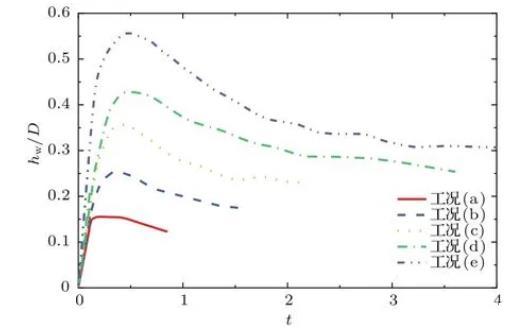 為了深入探究微米級水滴撞擊深水液池后空腔運動的基本特性,對本文五個模擬工況進行定量研究。描述空腔幾何特征的基本參數(shù)如圖5所示,以初始靜水狀態(tài)下深水液池的液面高度為基準(zhǔn)線,hw為基準(zhǔn)線至波浪頂端的波浪隆起高度,h為基準(zhǔn)線至空腔最低點的空腔深度,r為空腔基準(zhǔn)線上軸對稱點處至空腔側(cè)壁的空腔寬度。下文涉及的所有長度單位均為實際長度除以初始水滴直徑D后的無量綱長度,時間t為實際時間乘以Vi/D后的無量綱時間。