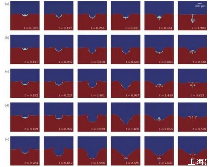 上述水滴撞擊水池的過程可以歸納為三個基本階段,第一階段為空腔的形成與膨脹;第二階段為毛細波傳播導(dǎo)致的空腔收縮;第三階段為空腔的回復(fù)。液滴撞擊深水液池時的運動分為完全聚結(jié)與部分聚結(jié)現(xiàn)象,在水滴與深水液池完全聚結(jié)時,水滴入水時由于水滴底部發(fā)生凹陷變形產(chǎn)生的氣泡夾帶隨著撞擊速度的增加而減小,而在部分聚結(jié)發(fā)生時氣泡的夾帶與截留行為則更為復(fù)雜。