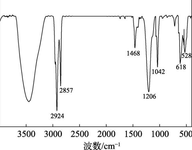 圖1為TAC的FTIR譜圖。從圖1可以看出,2924 cm–1處為主鏈甲基的C—H鍵的伸縮振動吸收峰;2857 cm–1處為主鏈亞甲基C—H鍵的伸縮振動吸收峰;1468 cm–1處為甲基和亞甲基C—H鍵的面內(nèi)搖擺振動吸收峰;1206 cm–1為磺酸基團(tuán)中C—S鍵的不對稱伸縮振動吸收峰;1042 cm–1處為胺基C—N鍵的面內(nèi)彎曲振動吸收峰,表明TAC結(jié)構(gòu)中存在季銨基。618和528 cm–1處為—SO 3-的中強(qiáng)吸收峰,表明TAC結(jié)構(gòu)中存在磺酸基。上述結(jié)果表明,TAC符合預(yù)先設(shè)計的結(jié)構(gòu)。