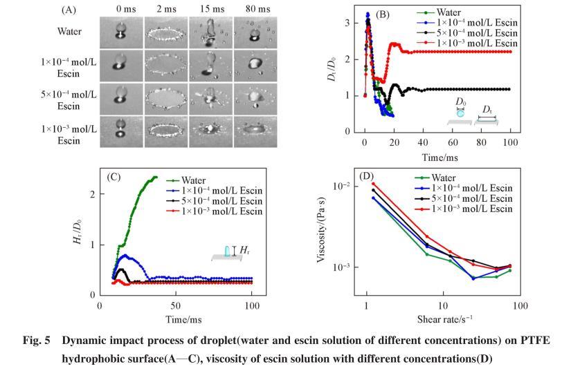圖5(A)展示了水和不同濃度七葉皂素溶液撞擊PTFE疏水表面的動(dòng)態(tài)過程.可以看出,水在撞擊PTFE表面后完全彈起,而且有較多飛濺碎裂,在80 ms時(shí)并不能潤(rùn)濕疏水表面.七葉皂素濃度為1×10-4mol/L時(shí),液滴在撞擊后仍有較大程度的反彈,但未能完全彈起,且平衡后在一定程度上實(shí)現(xiàn)了鋪展.當(dāng)濃度升高至5×10-4mol/L,液滴的反彈得到了明顯抑制,平衡后在疏水表面的沉積和鋪展有所改善.濃度進(jìn)一步升高至1×10-3mol/L時(shí),液滴不再有明顯的反彈趨勢(shì),且碎裂現(xiàn)象也得到了很好的抑制,平衡后能在表面很好地沉積和鋪展.