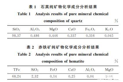 由表1可知,石英純礦物樣品中SiO2含量為98.37%,樣品中含有少量Al、Mg及其他微量元素,因此石英樣品可視為純礦物,滿足試驗(yàn)要求。由表2可知,赤鐵礦中TFe含量為68.24%,樣品中含有少量Si及其他微量元素,雜質(zhì)含量較少,因而赤鐵礦樣品可視為純礦物。