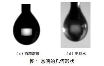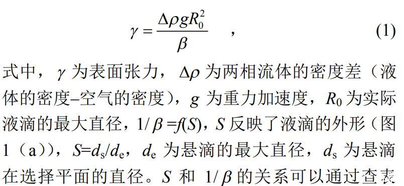 試驗為比較3種液體表面張力的大小,采用懸滴法對液體的表面張力進行測量,懸滴法的基本原理是:處于毛細管端液體懸滴的形狀與液體的表面張力有關(guān),在重力作用下,毛細管端形成的球形液滴的形變,隨著液滴有效密度的增加而增加并隨著液滴界面張力的增加而減小。通過Young–Laplace方程可以推導(dǎo)得到懸滴法計算表面張力的基本方程: