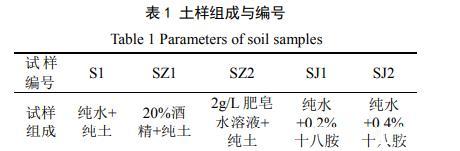 試驗用土取自云南省境內(nèi)昆曲高速公路嚴(yán)家山段,為淺灰色弱膨脹土,其自由膨脹率為55.7%,液限為41%,塑限為20.3%。取回的土樣經(jīng)過風(fēng)干、碾碎后過2 mm的篩備用。為研究氣–液界面張力對膨脹土干縮開裂的影響,采用3種不同表面張力的液體作為土中的液相,分別為:純水、體積百分?jǐn)?shù)為20%的酒精溶液和含量為2 g/L的肥皂水;通過在土體中混合斥水劑的方法配制不同接觸角的土樣,斥水劑十八烷基伯胺(C18H39N),簡稱:十八胺,為堿性白色蠟狀粉末,純度為99%,配制兩種斥水土樣,十八胺含量分別為:0.2%和0.4%。各土樣的成分和編號如表1所示。