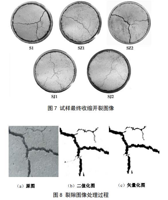 圖7給出了5個(gè)試樣在脫濕結(jié)束后對應(yīng)的收縮開裂圖像。從圖中可以看出,每個(gè)試樣均出現(xiàn)了不同程度的收縮裂隙,各試樣表面裂隙最終形態(tài)具有大致相似的規(guī)律:3條裂隙相交于一點(diǎn),把圓形表面分成了3個(gè)部分,S1樣和SZ2樣的裂隙較寬,試樣開裂明顯,其余試樣裂隙發(fā)育不明顯,裂隙在形成過程中先形成一條主裂隙,主裂隙發(fā)育過程中支裂隙開始發(fā)育,最終支裂隙和主裂隙相交形成3條裂隙。S1樣和SZ1樣不僅出現(xiàn)了裂隙,在試樣和鋼環(huán)接觸的地方還出現(xiàn)了明顯的分離,試樣出現(xiàn)了體縮,其余試樣也出現(xiàn)了不同程度的體縮,但并不明顯。為得到試樣的裂隙度,先要對采集到的試驗(yàn)開裂圖片進(jìn)行圖像處理,如圖8所示,先對采集到的膨脹土干縮過程圖像進(jìn)行二值化,去除一些非裂隙雜點(diǎn),再把二值化圖像進(jìn)行矢量化,矢量化后的圖像通過AUTOCAD提取試樣收縮面積和裂隙面積,最后計(jì)算出試樣的收縮開裂裂隙度: