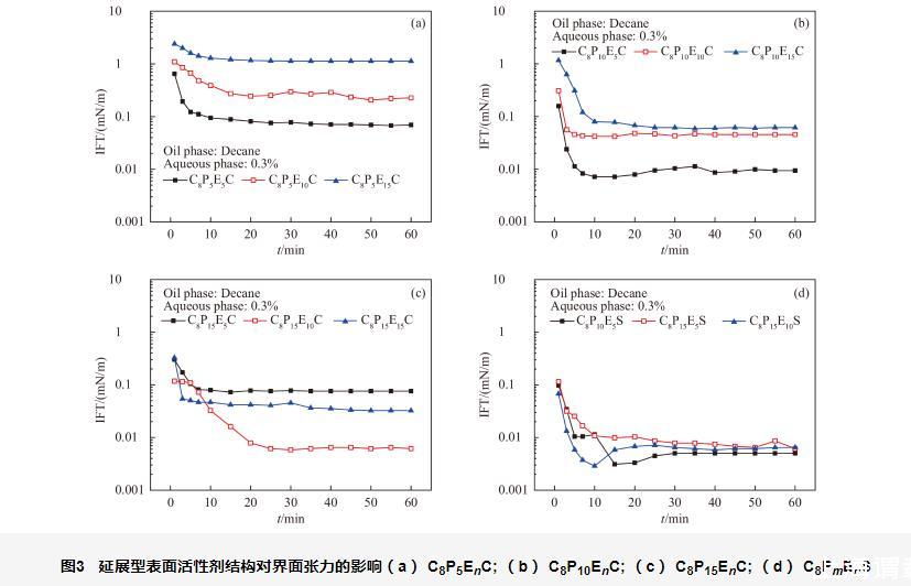 其它延展型表面活性劑溶液界面張力隨質(zhì)量分數(shù)的變化趨勢與C8P15E10C類似,不再列出。因此,選擇溶液質(zhì)量分數(shù)為0.3%進行后續(xù)的結(jié)構(gòu)-活性關(guān)系研究。